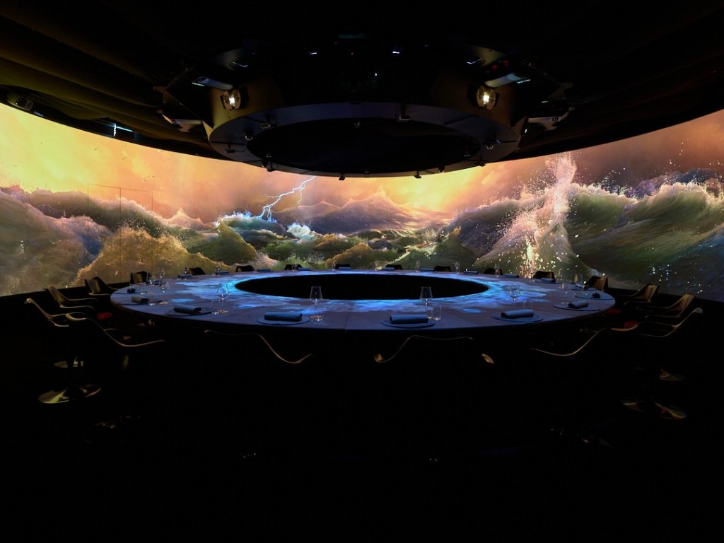 A essência do Krasota reside em seu conceito de jantar imersivo. Os convidados se sentam em uma sala circular onde projeções de 360 graus transformam o ambiente em uma tela viva. A cada ato, a narrativa visual se desenrola, sincronizada perfeitamente com uma trilha sonora original e, o mais importante, com a chegada de um novo prato. É uma coreografia impecável entre arte, som, sabor e tecnologia, onde a comida se torna parte integrante da performance. O menu degustação é uma obra de arte por si só, concebido para complementar e elevar a experiência visual, transformando a refeição em uma jornada de descobertas.
