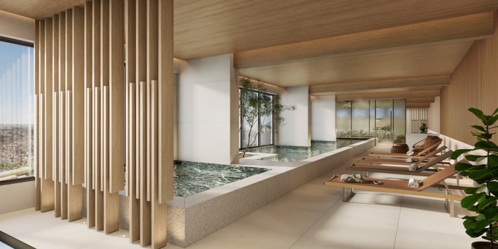 As áreas comuns foram pensadas como um “resort urbano”. O pavimento de lazer contará com ampla recepção e lobby com pé-direito duplo, piscina com raia, quadra de beach tennis e espaço para restaurante. O mezanino será dedicado a serviços e facilidades, como mini market, lavanderia compartilhada, pet wash, coworking e área de governança. Já o Rooftop Wellness oferecerá academia de cerca de 200 m², spa com sauna integrada à piscina interna aquecida, hidromassagem, banheira de gelo, salas de massagem, espaço de convivência e área gourmet.