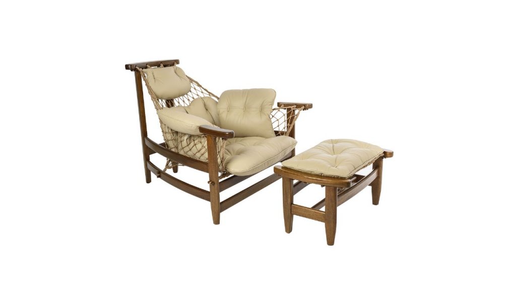 A poltrona Jangada é a concretização disso. Criada em 1968, ela foi considerada inovadora para a época. Com estrutura abaulada de madeira jacarandá, foi a primeira peça que usou uma rede de náilon para sustentar o estofado revestido de couro.