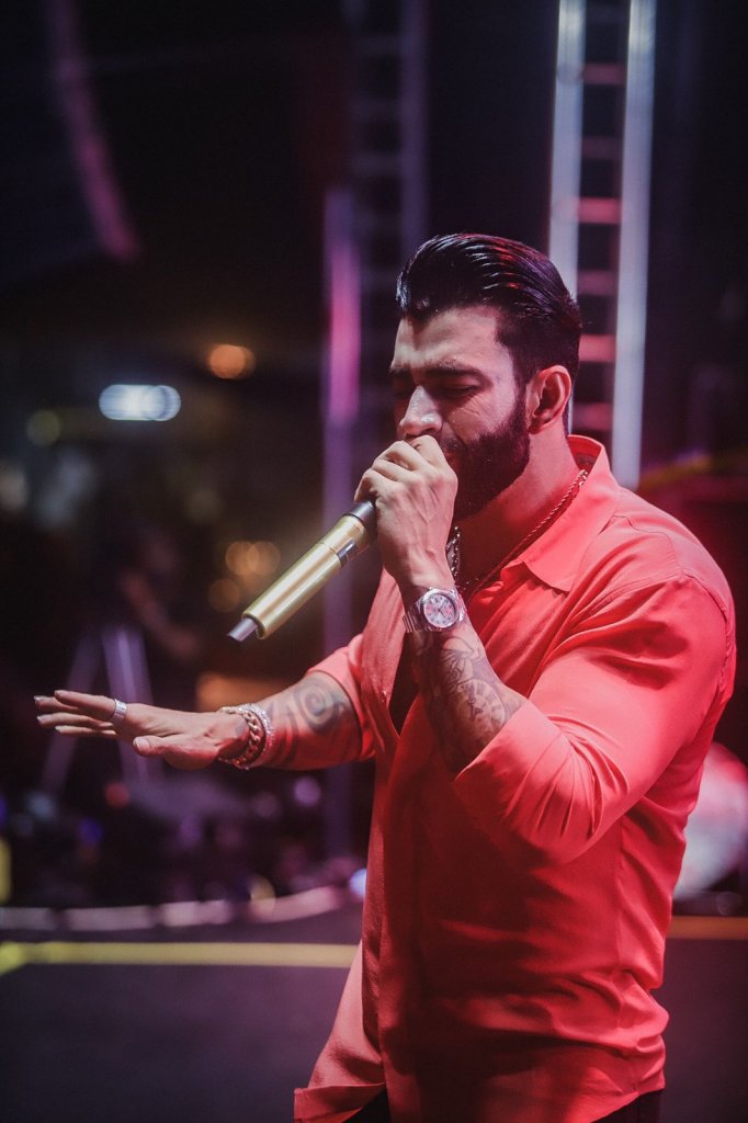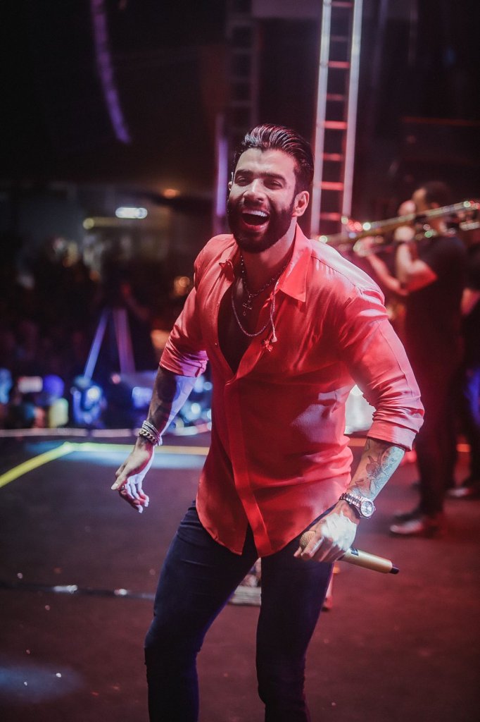 O cantor Gusttavo Lima animou a primeira noite de festa do Réveillon Praia Forte, nesta segunda-feira (27). Com um repertório repleto de sucessos, o cantor convidou ao palco o gigante Léo Santana, que também estava curtindo a festa.