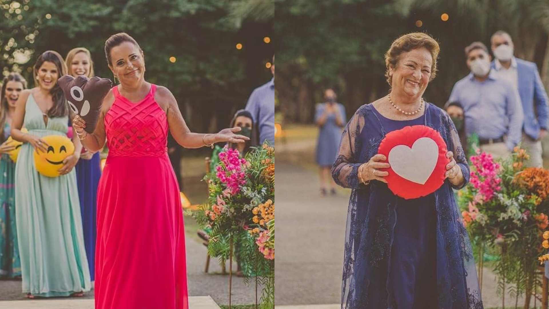 Beatriz revelou ainda que a amiga que ficaria responsável por levar o emoji de “cocozinho” não pôde comparecer à cerimônia, sendo assim sua mãe teve que assumir o lugar. Como última pessoa a desfilar com as figurinhas, a noiva escolheu sua avó, que carregava um coração, simbolizando o amor do casal e o fato de que o relacionamento que nasceu no Tinder, teve o match após João ver a foto de Beatriz com sua avó.