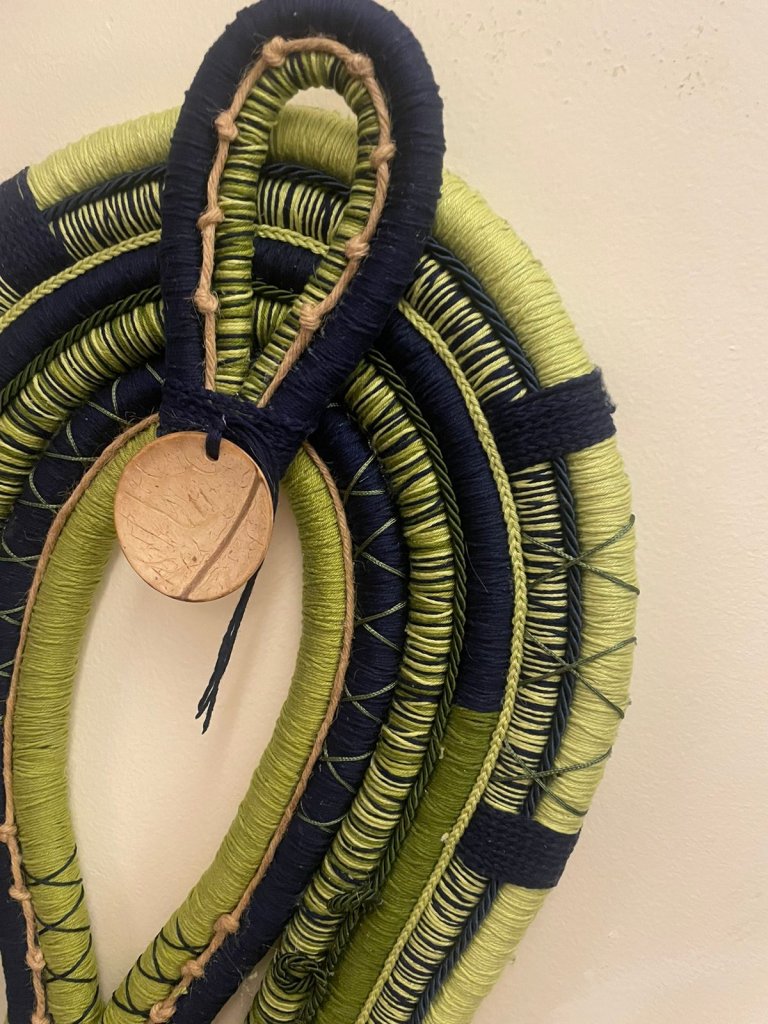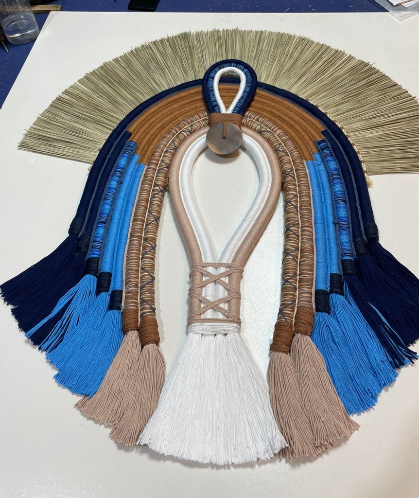 A técnica escolhida por ela é o Fiber Emballage, um trabalho minucioso que envolve repetição e precisão manual. Utilizando materiais como cordas de algodão, sisal, taboa, raízes, sementes e linhas, a artista costura com cuidado símbolos e significados em cada criação. “O fio que conecta, a força da terra, a proteção ancestral, a leveza da água, a sabedoria do subterrâneo e a promessa do renascimento”, explicou.