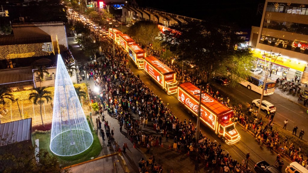 A ação faz parte da campanha “Pegue uma Coca-Cola e Viva o Natal”, que reforça a atmosfera característica do período, com caminhões iluminados e a presença de Papai Noel e Mamãe Noel percorrendo vias selecionadas. Os veículos passam em velocidade reduzida, permitindo que moradores acompanhem o trajeto ao longo do percurso.