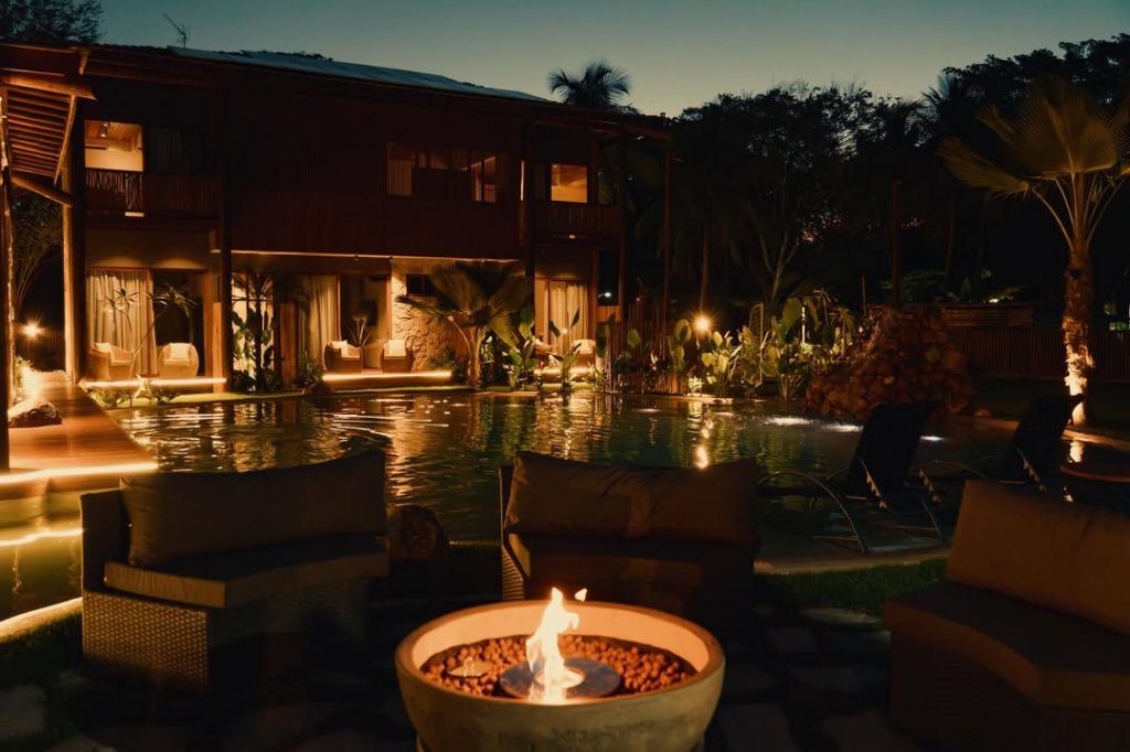 Na área externa, a experiência ganha ainda mais protagonismo. A piscina de design exclusivo, com iluminação cênica, foi pensada para remeter a uma prainha particular e se consolida como um dos pontos centrais da casa, especialmente no fim de tarde, quando o pôr do sol transforma o cenário. O projeto inclui ainda paisagismo tropical, ambientes abertos e fire pit no jardim.