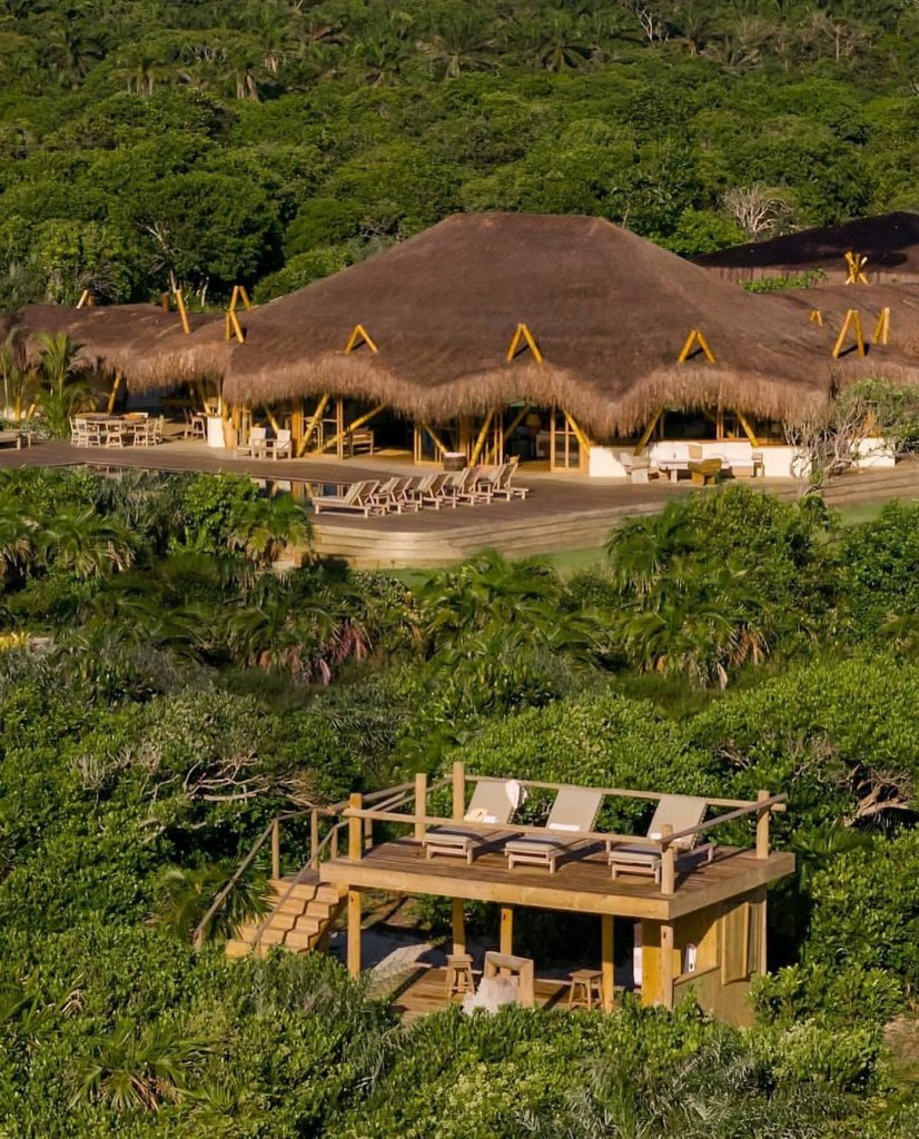 A estrutura inclui cinco suítes distribuídas em unidades independentes, conectadas por passarelas de madeira, além de uma oca central coberta de piaçava que funciona como sala de estar e espaço de convivência.