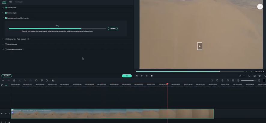 4. Na aba Vídeo, selecione a opção Iniciar Rastreamento. O Filmora X vai apresentar uma prévia da caixa seguindo o objeto de sua escolha. Quando o processo for concluído, uma barra colorida vai aparecer em cima do clip de vídeo, demonstrando a partir de qual momento o rastreio começa e termina;
