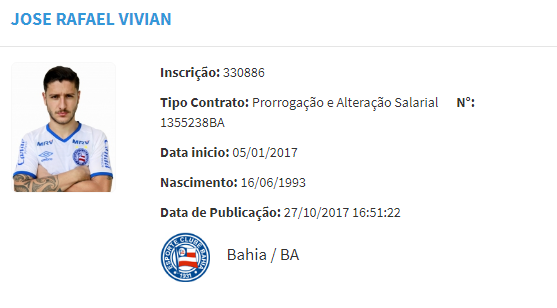 O meia Zé Rafael agora tem um novo contrato com o Bahia. Destaque do Campeonato Brasileiro com a camisa tricolor, o atleta acertou o aumento do seu vínculo até dezembro de 2020. A informação foi publicada na tarde desta sexta-feira (27) no Boletim Informativo Diário (BID) da Confederação Brasileira de Futebol (CBF). Zé Rafael, que está no clube desde o início do ano após ter sido comprado junto ao Coritiba, atuou em 53 partidas na temporada e marcou cinco gols. Suas atuações na competição nacional renderam o interesse de clubes do futebol paulista, entre eles o Corinthians (leia mais aqui).