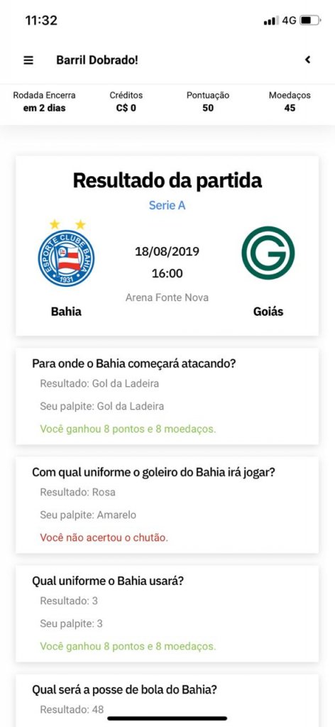 "O que a gente acha importante é que o torcedor tenha se engajado, criado ligas. Tivemos um processo de nivelar essa perguntas, que são de níveis diferentes, em que eles acumulam 'moedaços' diferentes se acertarem as perguntas. Quem 'turbina' determinada pergunta ganha mais moedaços, que são trocados por recompensas a partir dos preços que a gente define. O objetivo é trazer cada vez mais perguntas ligadas ao clube. Geralmente tem a pergunta sobre onde o Bahia vai atacar primeiro, e quem acompanha sabe que tradicionalmente o Bahia começa o primeiro tempo atacando para o gol da Ladeira. Isso serve para mexer com a percepção do torcedor e que ele se aproxime", explicou Bruno.