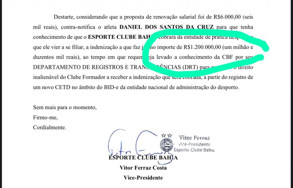 O Bahia Notícias apurou que essa indenização será cobrada pelo clube e tem o valor de R$ 1,2 milhão em caso de quebra da preferência pela renovação. Recentemente, em entrevista ao Sócio Digital, o presidente Guilherme Bellintani afirmou que essa multa seria de R$ 2 milhões, informação que não se confirma com o documento protocolado na Federação Bahiana de Futebol (FBF).