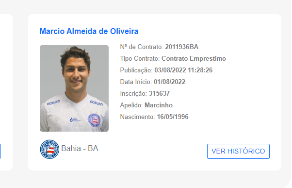Anunciado pelo Bahia na última segunda-feira (1º), Marcinho está oficialmente registrado pelo Tricolor. Seu nome foi publicado nesta quarta (3) no Boletim Informativo Diário (BID) da Confederação Brasileira de Futebol (CBF). Ele chega ao clube emprestado pelo Pafos FC, do Chipre, até o fim da Série B.