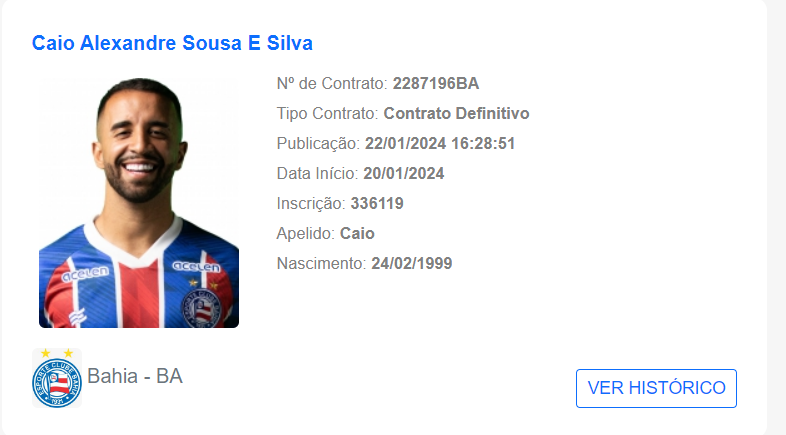 Anunciado oficialmente pelo Bahia na semana passada, o meio-campista Caio Alexandre já pode estrear pelo Tricolor. Na tarde desta segunda-feira (22), o jogador teve o seu nome publicado no Boletim Informativo Diário (BID) da Confederação Brasileira de Futebol (CBF).