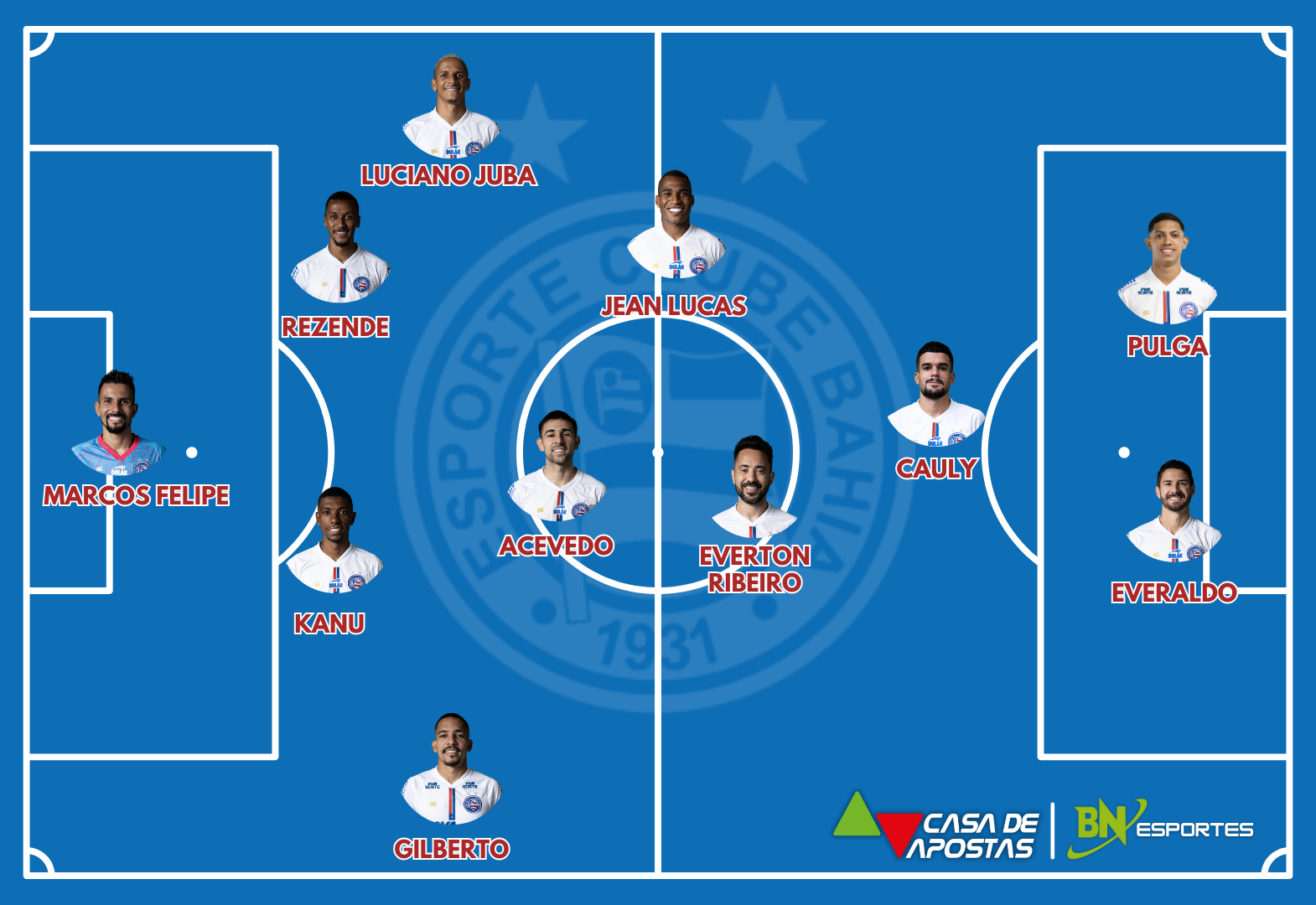 Bahia: Marcos Felipe, Gilberto (Kauã Davi), Kanu (Marcos Victor), Rezende e Luciano Juba; Acevedo, Jean Lucas, Everton Ribeiro e Cauly; Erick Pulga e Everaldo. Técnico: Rogério Ceni.
