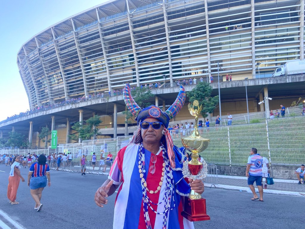 Nos arredores da Casa de Apostas Arena Fonte Nova neste domingo (16), antes da primeira partida da final do Campeonato Baiano, um torcedor do Bahia chamou a atenção ao chegar ao estádio carregando uma taça. Paulo Sérgio, frequentador assíduo das arquibancadas, demonstrou otimismo quanto à conquista do título estadual.