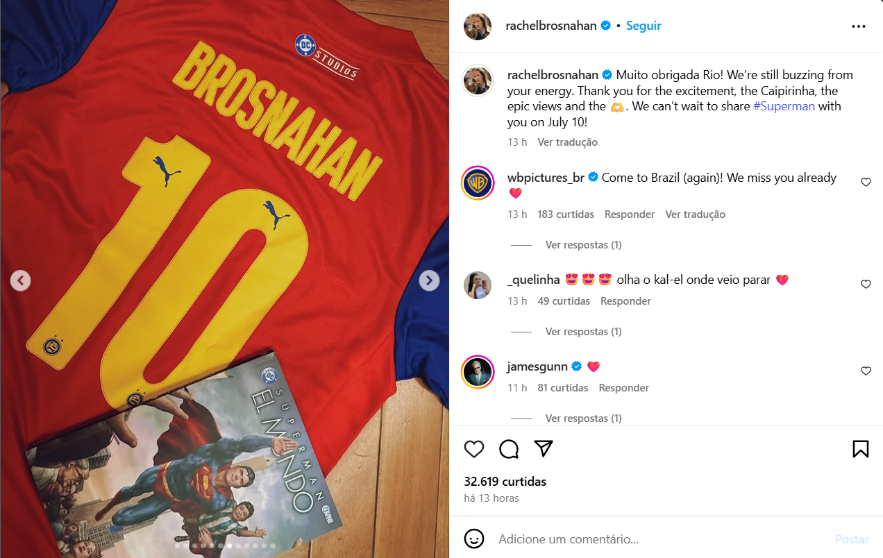 A camisa apareceu discretamente em um carrossel de fotos publicadas pela atriz durante sua passagem pelo Brasil para promover o filme. O visual da peça chamou atenção por remeter diretamente à identidade visual do herói da DC Comics, com destaque para os detalhes em azul, vermelho e amarelo, que coincidem com as cores do uniforme clássico do Superman.