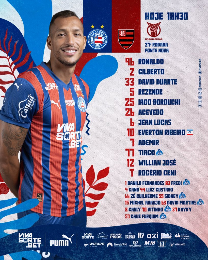 Confira as escalações oficiais de Bahia x Flamengo pelo Campeonato Brasileiro
