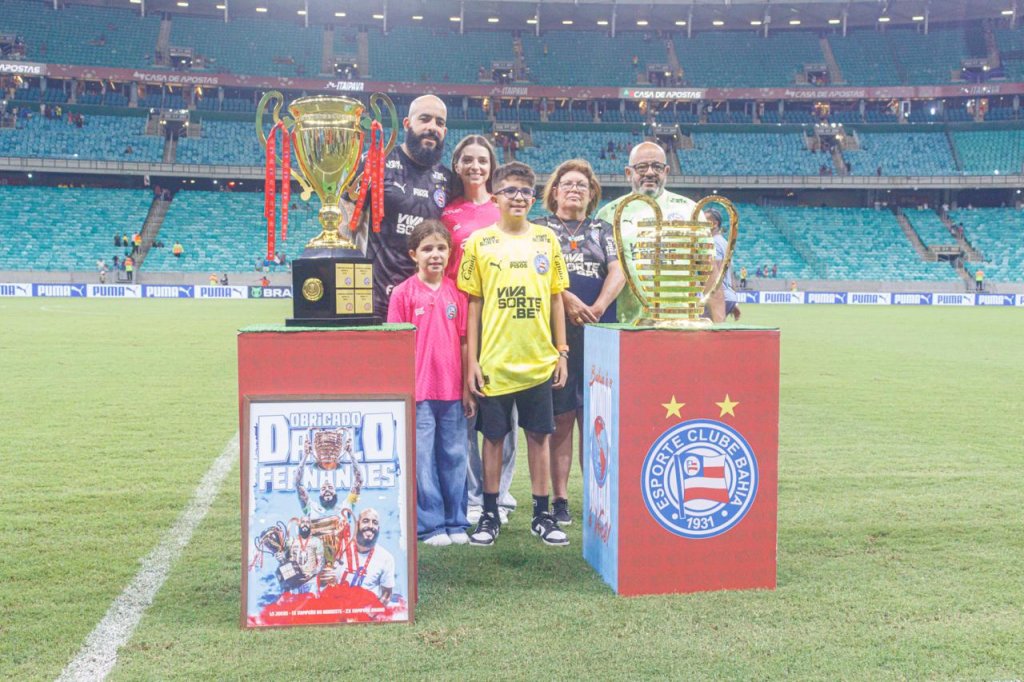 Após anunciar sua aposentadoria no BahêaCast da última terça-feira (2), o goleiro Danilo Fernandes foi homenageado pelo Bahia antes e após o triunfo de 2 a 0 sobre o Sport, válido pela 37ª rodada do Brasileirão 2025. Danilo disputou pelo Tricolor 64 jogos, vencendo dois Campeonatos Baianos (2023 e 2025) e uma Copa do Nordeste (2025).