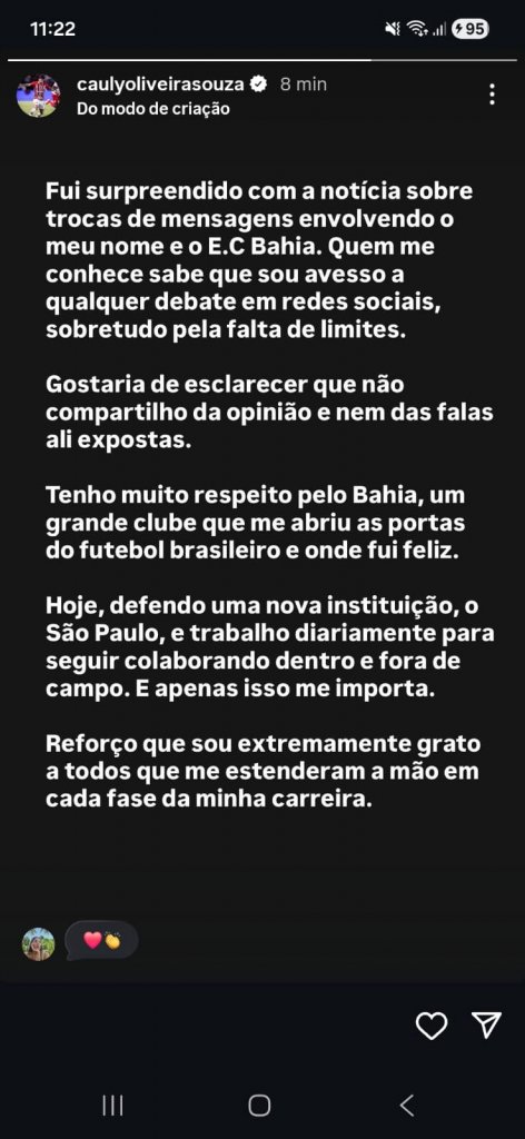 Diante da repercussão, Cauly utilizou suas redes sociais para se posicionar e negar qualquer alinhamento com as declarações, além de reforçar o respeito pelo clube baiano, ao qual ainda pertence.