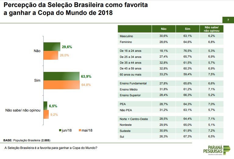 Apesar de registrar uma pequena queda, os brasileiros seguem confiantes na Seleção Brasileira na conquista do hexacampeonato mundial. A conclusão vem da pesquisa feita pelo Paraná Pesquisas, divulgado nesta sexta-feira (29). Cerca de 63,9% dos entrevistados acreditam no sucesso do time Canarinho na Rússia. No último mês de maio, 64,8% apontavam o time brasileiro como favorito. Enquanto 29,6% não apostam na equipe comandada pelo técnico Tite. A pesquisa foi realizada através de questionários Online, encaminhados para os contatos cadastrados no Grupo Paraná Pesquisas. No total, 2.885 brasileiros, com idades a partir dos 16 anos, em 188 municípios espalhados em 26 estados e no Distrito Federal responderam as perguntas. 52% dos entrevistados são do sexo feminino e os outros 48% do masculino. Os dados foram coletados no dia 28 de junho deste ano. Os brasileiros também mostraram interesse em acompanhar a disputa futebolística entre seleções. Cerca de 39,6% se disseram interessados no torneio e 23,5% declararam muito interessados. Os números apresentaram um bom aumento nesses quesitos em relação ao último mês, 39,6% contra 25,2% e 23,5% a 9,4%. Os entrevistados ainda responderam outras questões. 33,7% apontaram que o meia-atacante Philippe Coutinho será o maior destaque no desenrolar do Mundial, em seguida vem o atacante português Cristiano Ronaldo escolhido por 28,9%. O brasileiro Neymar tem a preferência de 10,2%. Messi com 4,1% e Suárez 2,1% completam a lista. Já sobre o técnico Tite, 52,5% disse que o desempenho do comandante está dentro das expectativas, enquanto que para 26% o treinador está melhor do que o esperado. A pesquisa de grau de confiança de 95% para uma margem de erro de aproximadamente 2%.