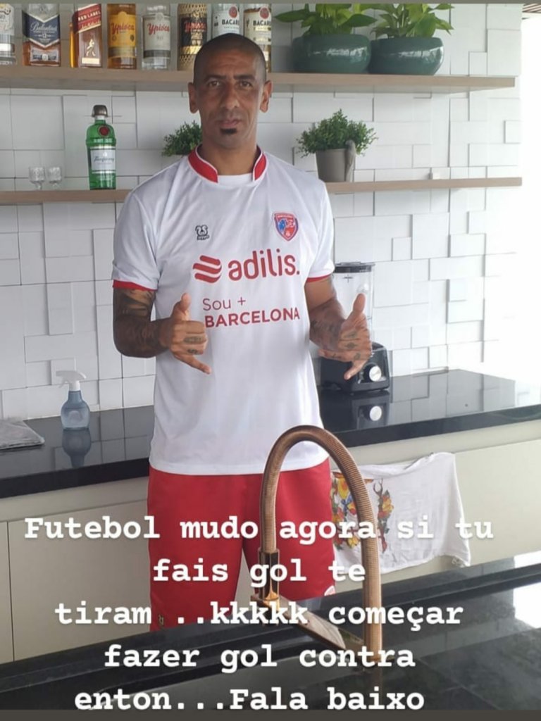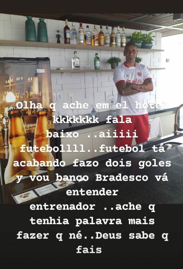 "Olha o que achei no hotel... Fala baixo... Aiii futebol... Futebol está acabando, faço dois gols e vou pro banco, vá entender... Achei que tinha palavra, mas fazer o que, né... Deus sabe o que faz", escreveu na publicação ao lado de uma cervejeira. "Futebol mudou agora. Se você faz gol te tiram. Começar a fazer gol contra então... Fala baixo", completou.