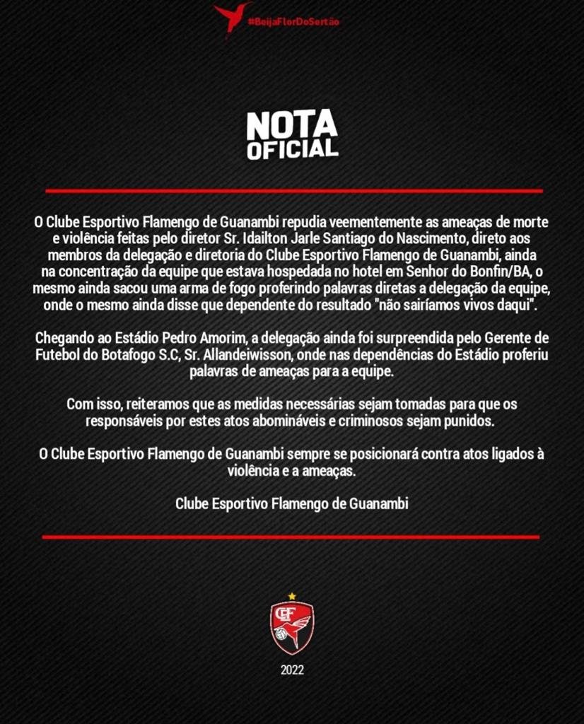 O Flamengo de Guanambi fez um denúncia nas suas redes sociais neste domingo (10) acusando um diretor do Botafogo-BA de fazer ameaça de morte, em Senhor do Bonfim, antes do jogo entre as duas equipes pela Série B do Baiano. Segundo o clube, Idailton Jarle Santiago do Nascimento foi até o hotel onde estava a delegação Beija-Flor do Sertão e com uma arma na mão disse que ninguém sairia vivo independente do resultado da partida, pela 11ª e última rodada da primeira fase.