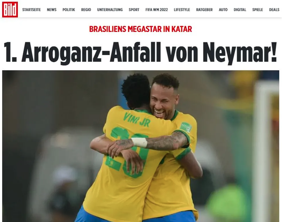 O jornal alemão Bild detonou o atacante Neymar, na noite deste domingo (20), por simular o escudo da Seleção Brasileira com a sexta estrela, que seria o hexacampeonato mundial. O jogador publicou a foto do short, que faz parte do traje de viagens do time Canarinho, nas redes sociais e foi criticado pelo periódico.