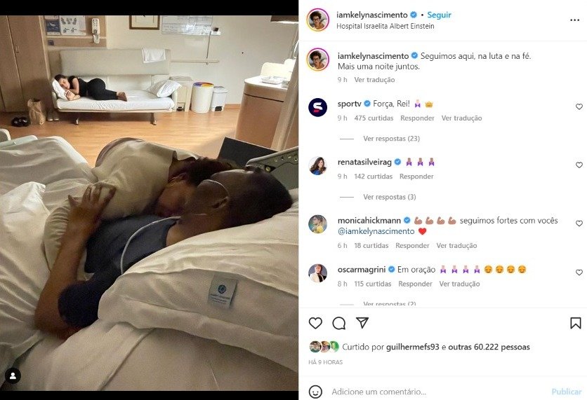 Kely Nascimento, filha de Pelé, postou uma foto com o pai na noite desta sexta-feira (24). Na imagem, ela está abraçada ao Rei do Futebol, que segue internado no Hospital Albert Einstein, em São Paulo, para reavaliação do tratamento de um câncer no cólon.
