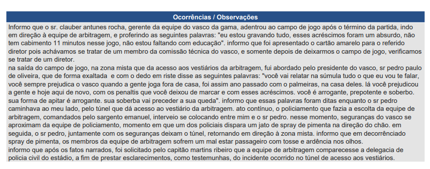 O texto também confirma que a intervenção policial, comandada pelo sargento Emanuel, contou com o disparo de spray de pimenta em direção ao chão para separar os seguranças do Vasco da equipe de arbitragem, o que causou tosse e ardência nos olhos dos juízes.