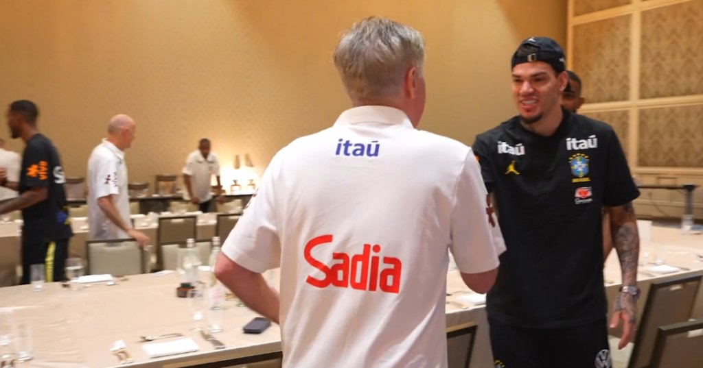 Goleiro Ederson cumprimentando o técnico da Seleção Brasileira, Carlo Ancelotti | Foto: Reprodução / CBF TV