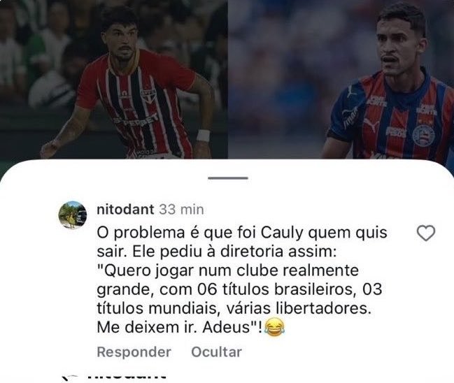 A discussão teve início com uma publicação de um influenciador ligado ao Bahia, que ironizou a negociação do atleta com o São Paulo. A postagem rapidamente se espalhou e acabou chegando até o pai do jogador, que decidiu se posicionar.
