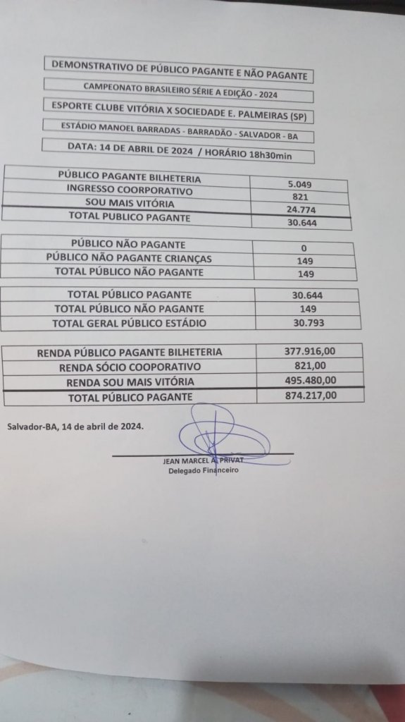 Neste domingo (14), no Barradão, Vitória e Palmeiras se enfrentaram pela primeira rodada do Campeonato Brasileiro e o Verdão venceu pelo placar de 1 a 0. No total, 30.793 pessoas estiveram presentes no Estádio Manoel Barradas para uma renda de R$ 874.217,00.