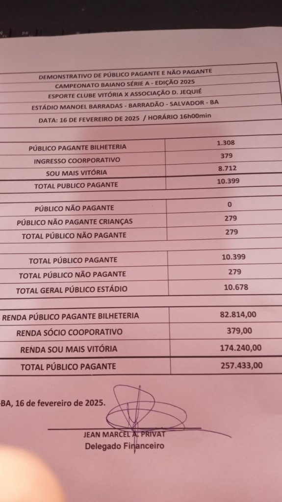A renda de R$ 257.433,,00 foi dividida em R$ 82.814,00 dos pagantes da bilheteria, junto a R$ 379,00 dos pagantes corporativos e R$ 174.240,00 dos sócios do Sou Mais Vitória.
