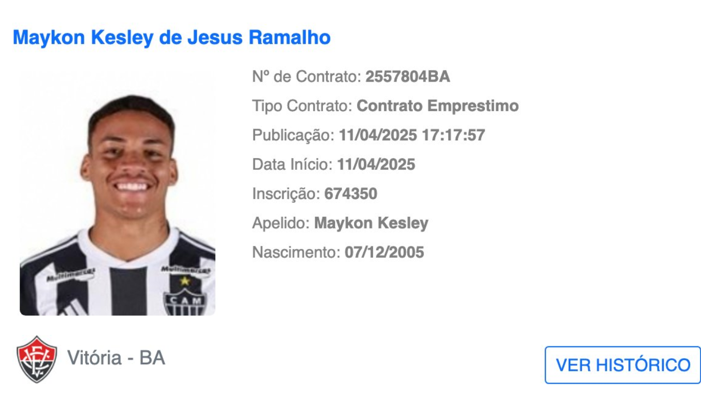 O Vitória acertou a contratação por empréstimo do lateral-esquerdo Maykon Kesley, do Atlético-MG. Maykon, que estava emprestado ao Noroeste, se destacou nesta temporada do Campeonato Paulista e chega ao Rubro-Negro com vínculo até o final de 2025.