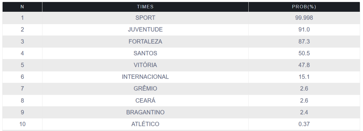 De acordo com o Departamento de Matemática da UFMG (Universidade Federal de Minas Gerais), especialista em probabilidades do futebol brasileiro, o Vitória é hoje o quinto time com mais chances de queda, com 47,8%. O Santos vem logo à frente, com 50,5%. Já Fortaleza (87,3%), Juventude (91%) e Sport (99,99%) seguem como os mais ameaçados.