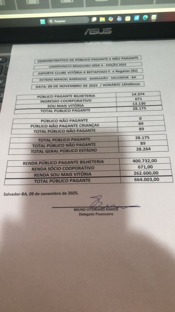 Neste domingo (9), o Vitória empatou com o Botafogo por 0 a 0 em partida válida pela 33ª rodada da Série A. No Estádio Manoel Barradas, 28.264 torcedores estiveram presentes para uma renda de R$664.003,00.