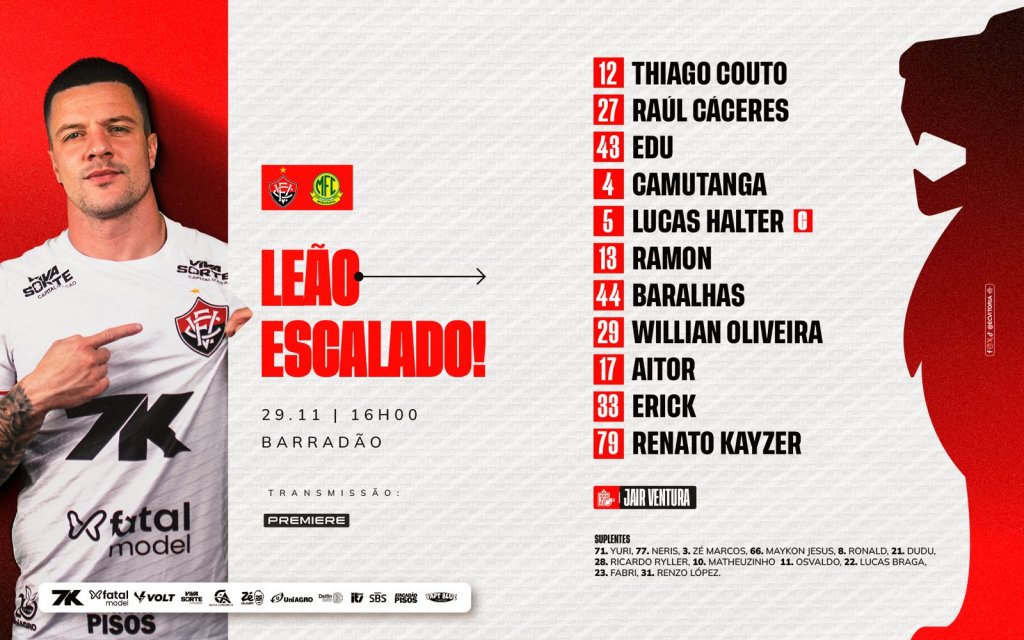 O Vitória de Jair Ventura vai entrar em campo com: Thiago Couto; Raúl Cáceres, Edu, Camutanga e Lucas Halter; Ramon, Baralhas e Willian Oliveira; Aitor, Erick e Renato Kayser.