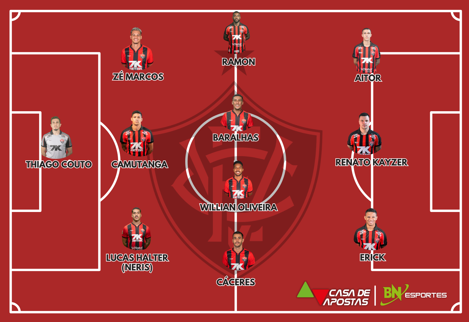 Vitória: Thiago Couto; Lucas Halter (Neris), Camutanga e Zé Marcos; Raúl Cáceres, Willian Oliveira, Baralhas e Ramon; Erick, Aitor e Renato Kayzer. Técnico: Jair Ventura.