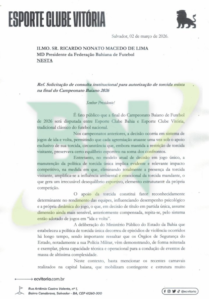 No documento assinado pelo presidente rubro-negro Fábio Mota, enviado à Federação Bahiana de Futebol (FBF) e obtido com exclusividade pelo Bahia Notícias, o Vitória defende a divisão igualitária da capacidade do estádio entre as torcidas. O clube argumenta que a manutenção da torcida única em uma decisão disputada em jogo único provoca desequilíbrio técnico na competição.