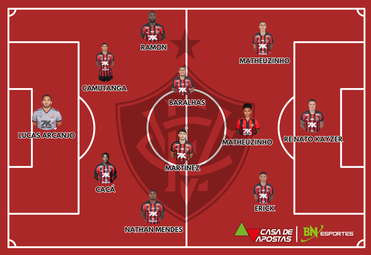 Vitória: Lucas Arcanjo; Nathan Mendes, Cacá, Camutanga e Ramon; Baralhas, Martínez e Matheuzinho; Tarzia, Erick e Renato Kayzer. Técnico: Jair Ventura