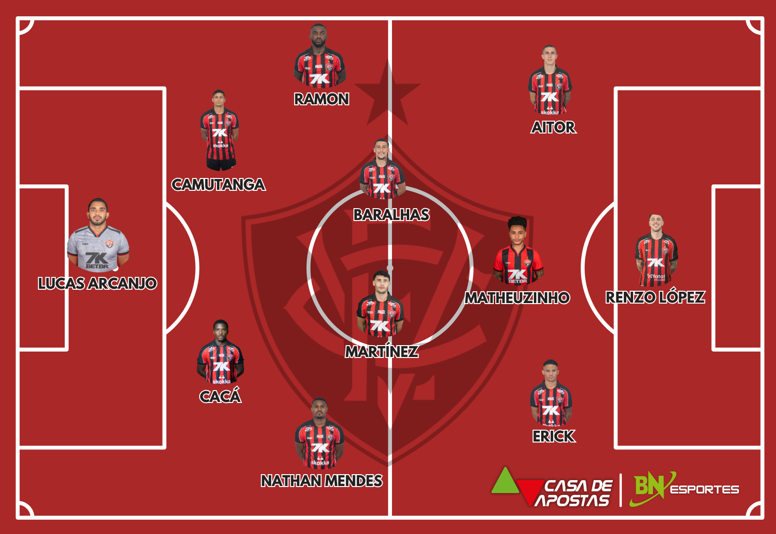 Vitória: Lucas Arcanjo; Nathan Mendes, Cacá, Camutanga e Ramon; Baralhas, Martínez e Matheuzinho; Aitor, Erick e Renato Kayzer. Técnico: Jair Ventura.