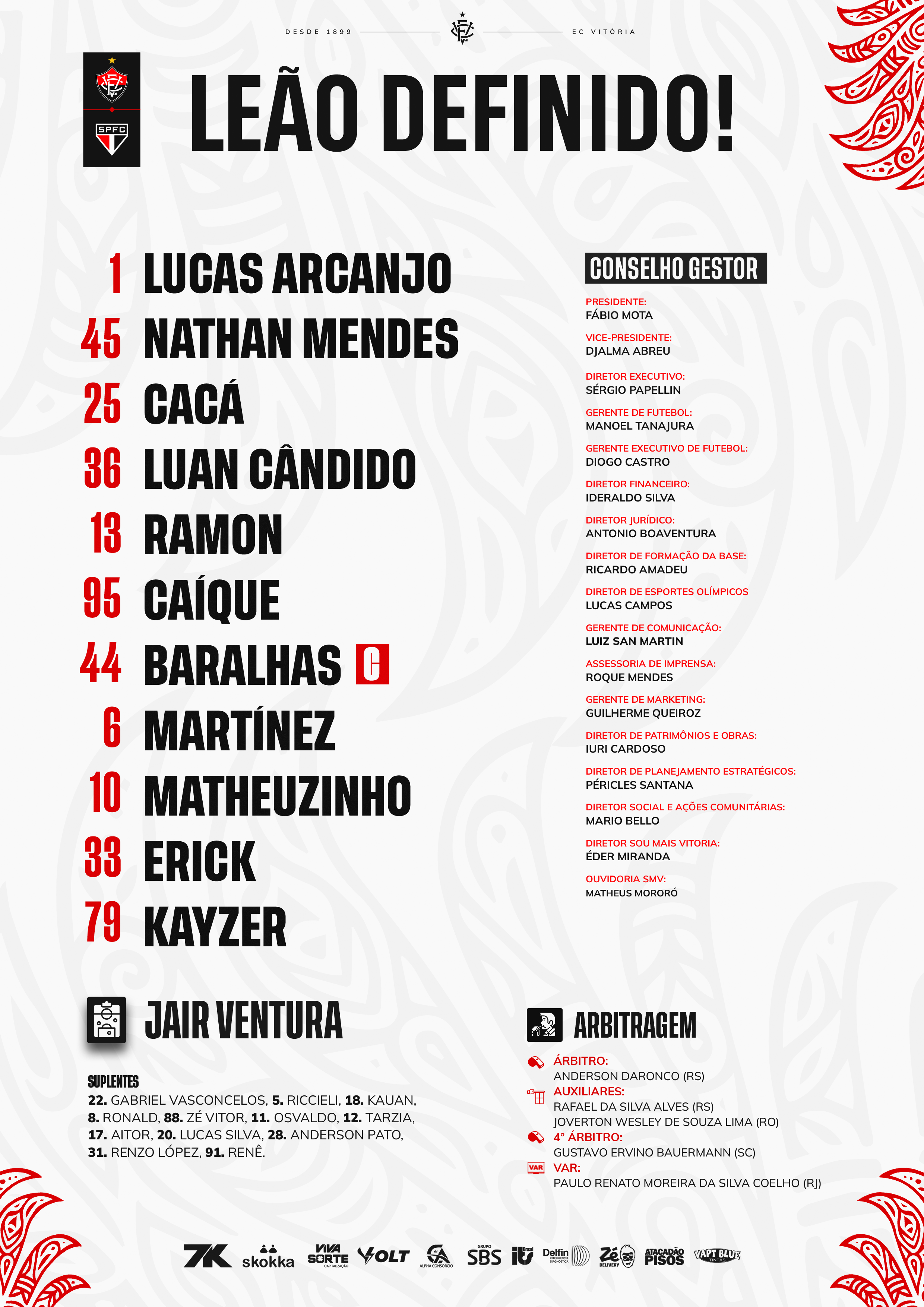Já o São Paulo de Roger Machado foi escalado com Rafael; Lucas Ramon, Alan Franco, Rafael Toloi e Enzo Díaz; Marcos Antônio, Danielzinho, Artur, Cauly e Ferreirinha; André Silva.