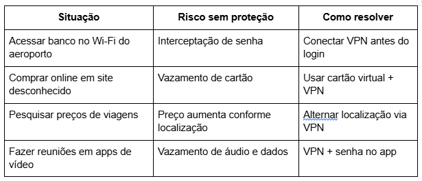 Hotéis, shoppings, aeroportos, cafés e espaços de trabalho compartilhado oferecem Wi-Fi aberto como comodidade. Porém, essas redes muitas vezes não são criptografadas, o que significa que qualquer pessoa com conhecimento básico pode: