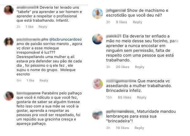 Mais tarde, o ator fez um post agradecendo pelo show e pelos seis meses junto com o grupo. Contudo, nos comentários, recebeu diversas críticas pela atitude. "Se você se orgulha de ter assediado uma mulher trabalhando, parabéns, que profissional de merda que você é", alertou uma seguidora. "Brincadeira' idiota a sua com a segurança hein", apontou outro. Confira o vídeo e algumas reações: