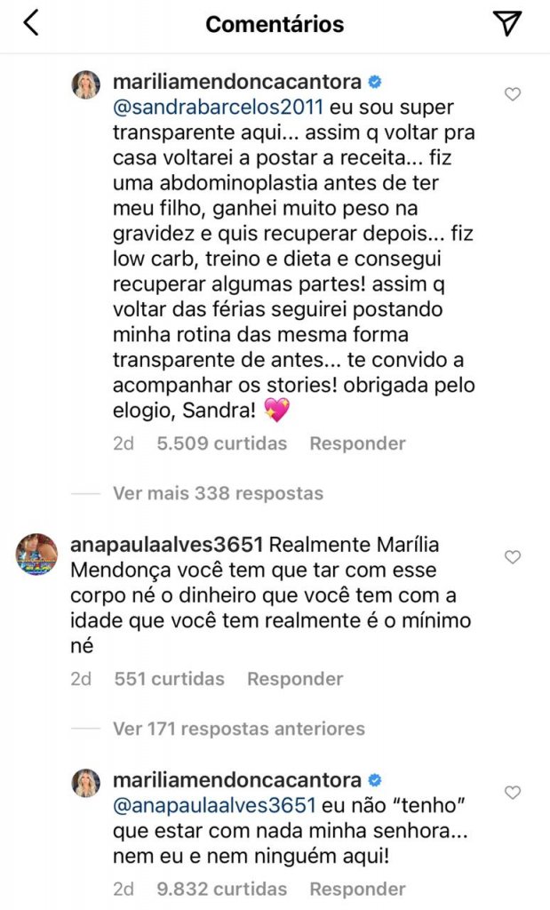 Porém, uma seguidora escreveu: "Realmente, Marília Mendonça, você tem que estar com esse corpo, né, o dinheiro que você tem e com a idade que você tem realmente é o mínimo", disparou.