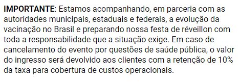 Em seu site de vendas, o Réveillon Nº1 (confira mais sobre o show), de Itacaré, afirma estar acompanhando a evolução da vacinação no Brasil e pontua: "Em caso de cancelamento do evento por questões de saúde pública, o valor do ingresso será devolvido aos clientes com a retenção de 10% da taxa para cobertura de custos operacionais".