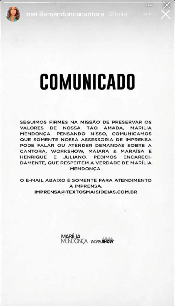"Seguimos firmes na missão de preservar os valores de nossa tão amada Marília Mendonça. Pensando nisso, comunicamos que somente nossa assessoria de imprensa por falar ou atender demandas sobre a cantora", informava o comunicado.