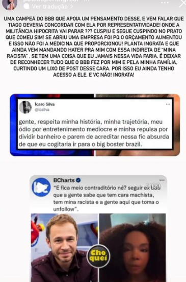 "Uma campeã do 'BBB' que apoia um pensamento desse e vem falar que o Tiago deveria concordar com ela por representatividade! Onde a militância hipócrita vai parar? Cuspiu e segue cuspindo no prato que comeu sim! Se abriu uma empresa foi porque o orçamento aumentou e isso não foi a medicina que proporcionou! Planta ingrata e que ainda vem mandando hater para mim com essa indireta de 'mina racista’”, iniciou Paula, que teve sua passagem no reality da Globo marcada por falar racistas.