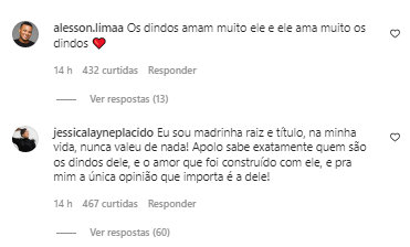 “Os dindos amam muito ele e ele ama muito os dindos”, comentou Alesson. “Eu sou madrinha raiz e título na minha vida nunca valeu de nada! Apolo sabe exatamente quem são os dindos dele, e o amor que foi construído com ele, e pra mim a única opinião que importa é a dele”, disse Jéssica.