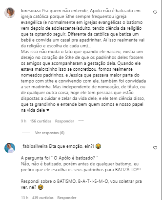“Apolo já é batizado?”, perguntou o seguidor. Os influenciadores Lore Souza, Alesson Lima e Jéssica Laye são os padrinhos do menino, mas Fábio respondeu que acha o assunto delicado.