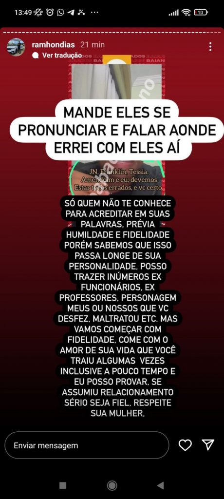 "Só quem não te conhece para acreditar em sua palavras. Prévia (sic) humildade e fidelidade, porém sabemos que isso passa longe de sua personalidade. Posso trazer inúmeros ex-funcionários, ex-professores, personagens meus que você desfez, maltratou, etc. Mas vamos começar com fidelidade. Como com o amor de sua vida que você traiu algumas vezes. Inclusive, a pouco tempo e eu posso provar. Se assumiu relacionamento sério, seja fiel. Respeite sua mulher", escreveu em um Story, que foi apagado minutos depois.