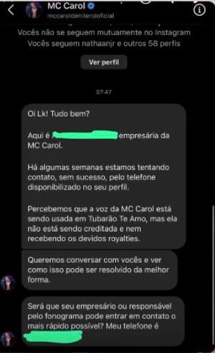“Há algumas semanas estamos tentando contato, sem sucesso, pelo telefone disponibilizado no seu perfil. Percebemos que a voz da MC Carol está sendo usada em Tubarão Te Amo, mas ela não está sendo creditada e nem recebendo os devidos royalties. Queremos conversar com vocês e ver como isso pode ser resolvido da melhor forma”, escreveu a equipe.